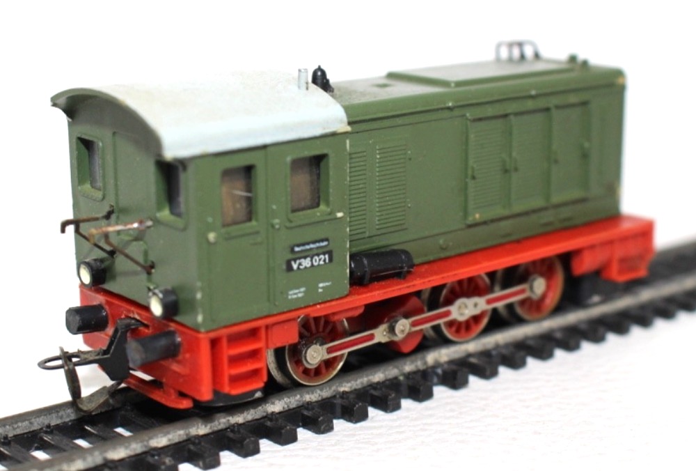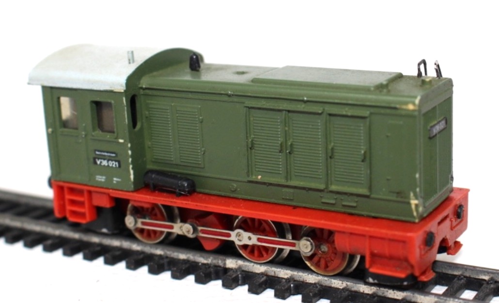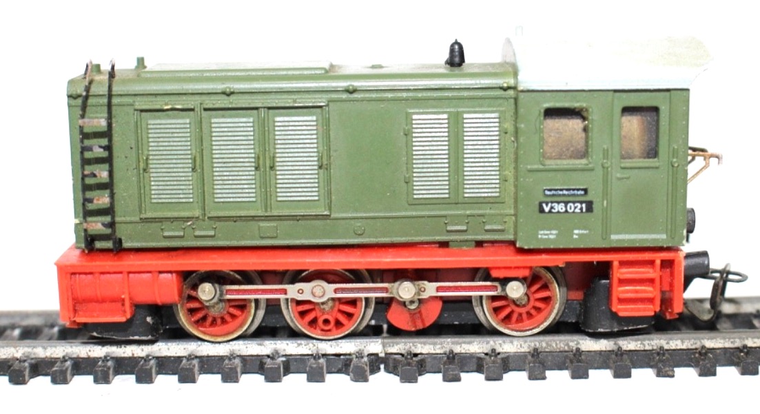 Grüne Lackierung der Deutschen Reichsbahn mit rot abgesetztem Fahrwerk. Beschriftung entsprechend der Betriebsnummer V36 021.