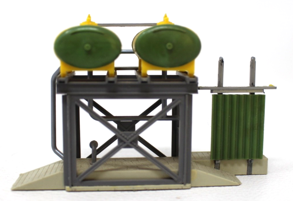 Im fertig aufgebauten Zustand besitzt die Anlage eine Länge von ca. 10,5 cm, eine Breite von etwa 3,5 cm sowie eine Höhe von rund 6,5 cm. Durch diese schlanke Bauform lässt sich die Tankstelle platzsparend direkt an Gleisanlagen oder in schmale Betriebswerksbereiche integrieren, ohne an Wirkung zu verlieren.
