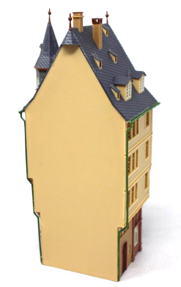 Der Bausatz besteht aus passgenauen Kunststoffteilen und wird fertig montiert sowie farblich unbehandelt geliefert. Dadurch sind individuelle Farbgestaltung und realistische Alterung problemlos möglich. Ein stabiles, detailreiches Altstadthaus mit hohem Wiedererkennungswert.