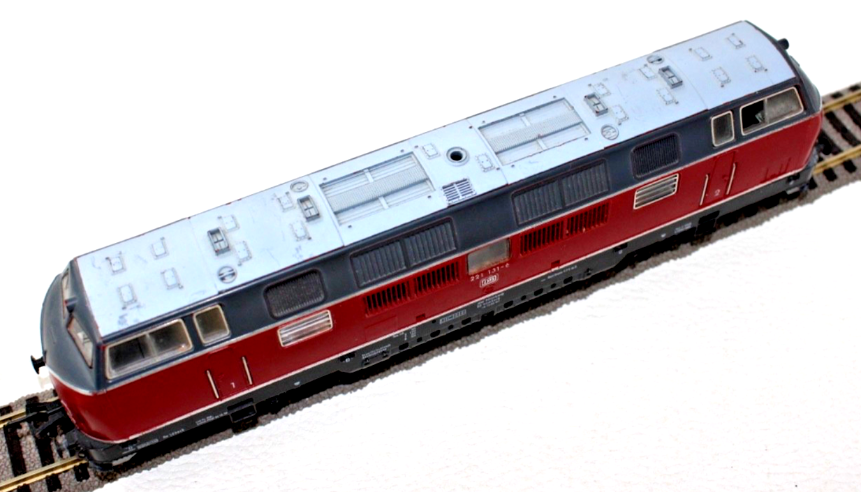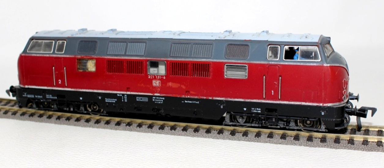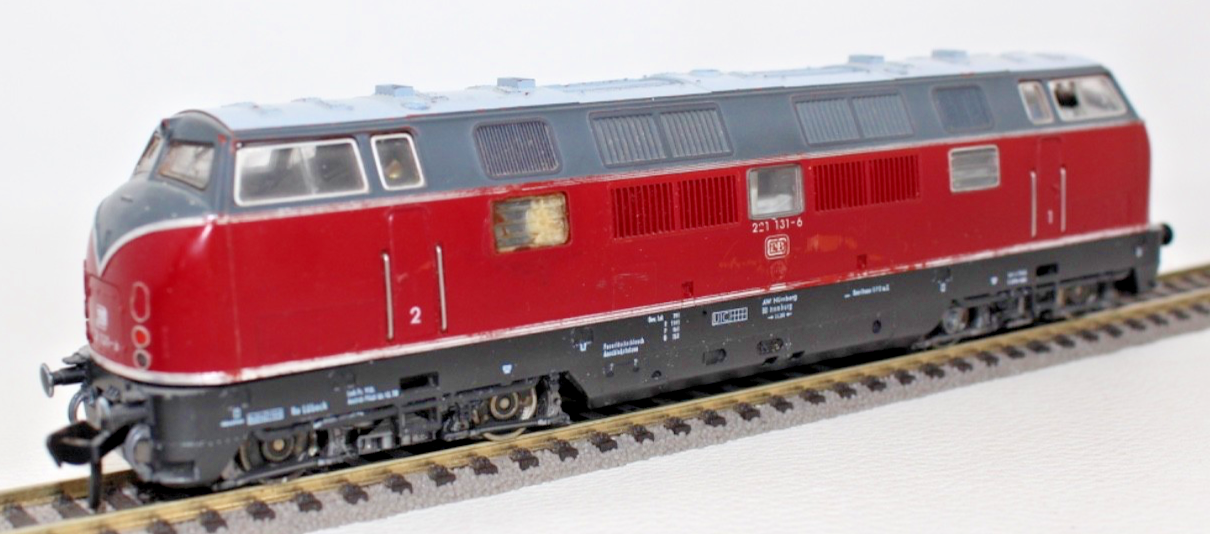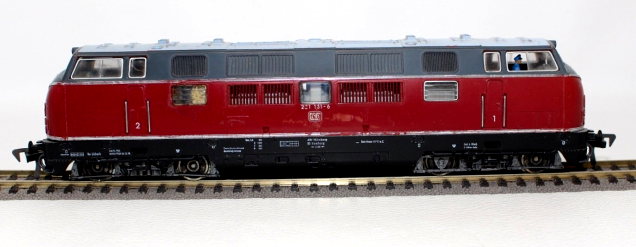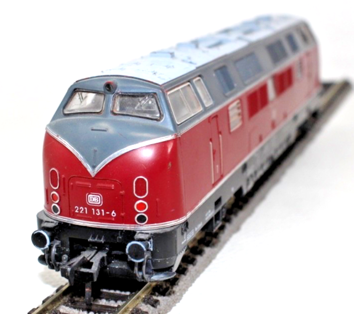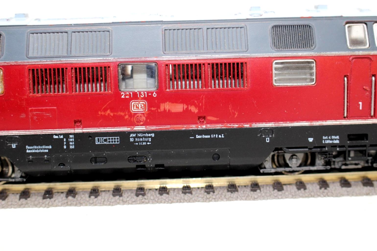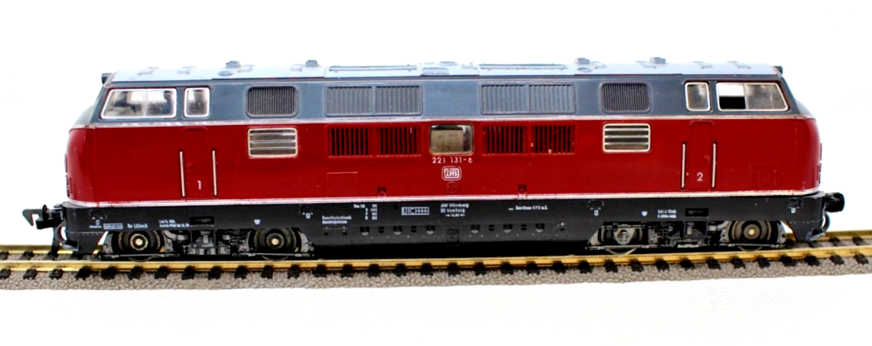 Ausführung in klassischem Rot der Deutschen Bundesbahn mit schwarzem Fahrwerk. Beschriftung entsprechend der Betriebsnummer 221 131-6.