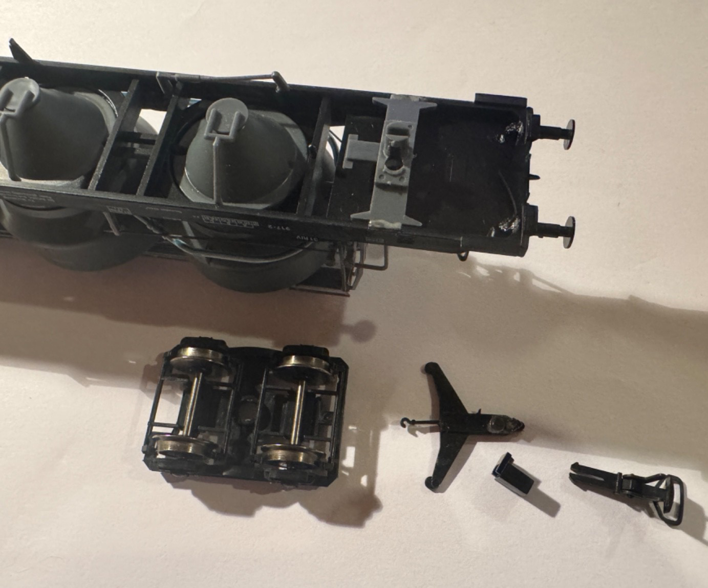 - Der Wagen wird in den Einzelteilen geliefert. Ein Bastler sollte diesen nach dem Ersetzen der Kupplungshalterungen schnell wieder nutzen können