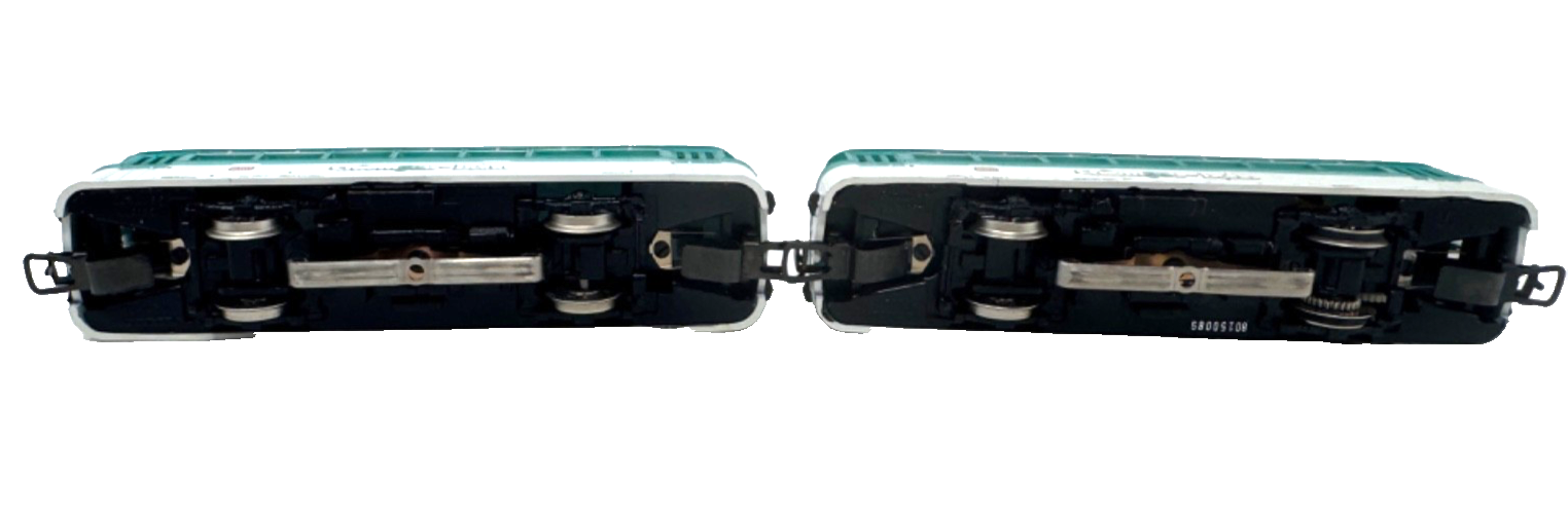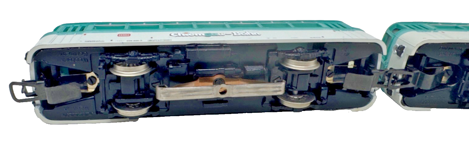 Zweiteiliges Schienenbus-Set, Kunststoffgehäuse. Ein Motorwagen und einen Beiwagen. Aufschrift Chiemgau-Bahn