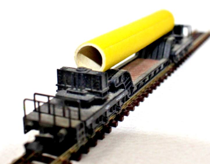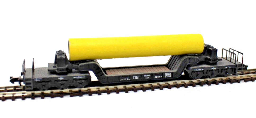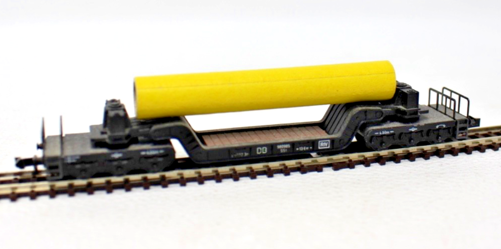 Die Rohrladung (Eigenbau) stellt ein großes Rohr dar und verleiht dem Wagen ein authentisches Erscheinungsbild im Güterzug. Dadurch eignet sich das Modell besonders gut für Industrie- oder Baustellenverkehre auf der Modellbahnanlage.