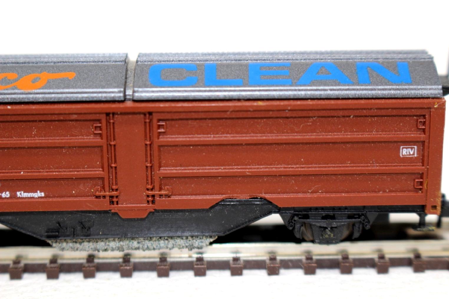 Der Wagen ist in einer braunen Farbgestaltung mit „Roco Clean“-Beschriftung ausgeführt und hebt sich damit optisch von klassischen Güterwagen ab. Fahrwerk und Untergestell sind dunkel gehalten, während die aufgedruckten Logos und Beschriftungen den funktionalen Charakter des Reinigungswagens unterstreichen.